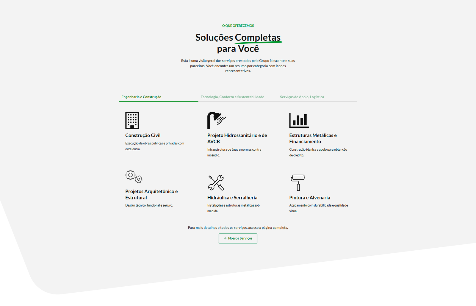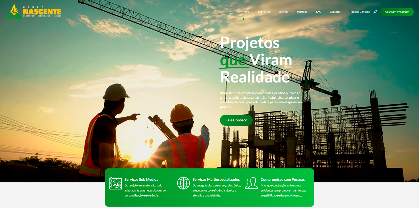 O Grupo Nascente é um grupo empresarial brasileiro especializado em serviços de construção civil, infraestrutura técnica, licitações públicas e manutenção predial para clientes corporativos e institucionais. A empresa atua com soluções integradas para obras, projetos complexos, serviços de apoio e logística, sempre com foco na qualidade técnica, sustentabilidade e satisfação do cliente.