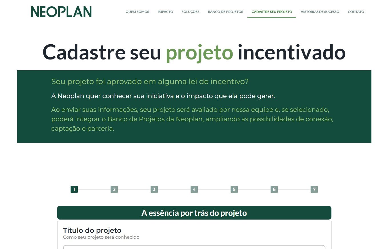 A Neoplan é uma plataforma de cadastro e promoção de projetos sociais com filtros inteligentes por estado, valor e benefícios. Organiza dados com clareza, conecta iniciativas a investidores e amplia o impacto social com tecnologia e transparência.