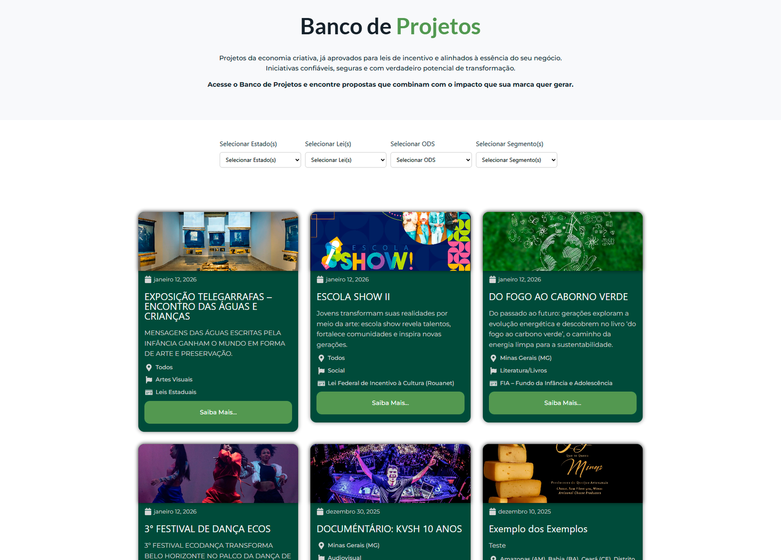 O sistema conta com um motor de busca avançado que permite segmentar os projetos por: